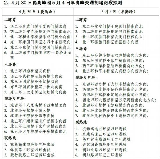 5月4日是节后不限行工作日,早高峰拥堵水平将超过同期周一,7:30至9:00路网持续拥堵,重点路段集中在主要环路和联络线进城方向。