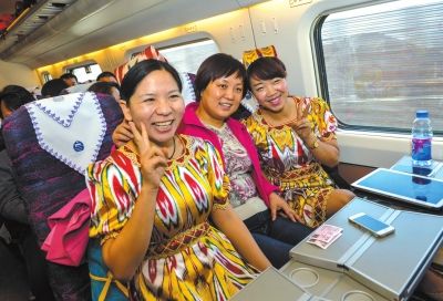 11月16日,来自湖北的孙珍珍(左)和乌鲁木齐的刘雪琴(右)乘坐D8602次列车时特意穿上了民族服装。新华社发