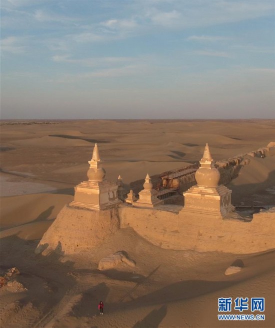 9月16日,游人参观夕阳下的黑城遗址。进入秋季,内蒙古自治区阿拉善盟额济纳旗迎来旅游旺季,大漠中的黑城遗址吸引了众多游客。黑城又名黑水城,为西夏王朝“黑山威福军司”所在地,元代设亦集乃路总管府,这里曾是古代居延道路的交通要冲。新华社记者 邓华 摄