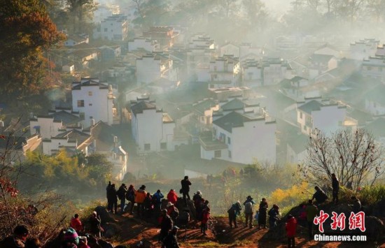 11月28日,冬日清晨,正是江西省婺源县大鄣山乡石城古村一年一度最美的时节。炊烟在重峦叠嶂中缭绕,一幢幢白墙黛瓦的徽派古民居与高大的红枫在晨曦照耀下交相辉映,美不胜收。程新德 摄
