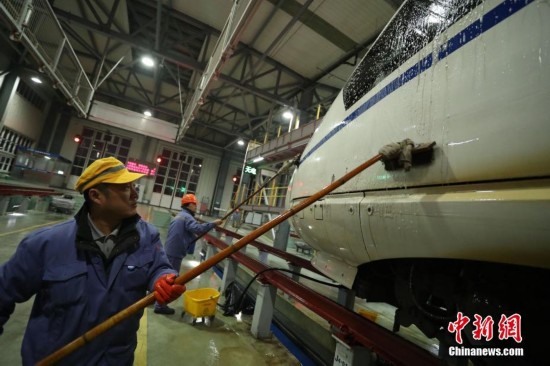 1月8日晚,一列和谐号高铁列车缓慢驶入上海虹桥动车运用所,车头部分沾满了厚厚的“雾霾妆”,在列车入库前除了对外皮自动清洗外,车头部分还需人工特别精洗“卸妆”,一趟400米的长编列车清洗完毕大约需要45分钟,每组工人一晚要清洗20多个“雾霾车头”,直到清晨。工作人员表示黄褐色的污迹最难清洗。中新社记者 张亨伟 摄