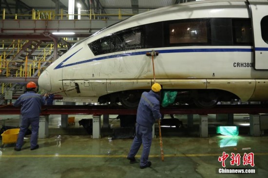 1月8日晚,一列和谐号高铁列车缓慢驶入上海虹桥动车运用所,车头部分沾满了厚厚的“雾霾妆”,在列车入库前除了对外皮自动清洗外,车头部分还需人工特别精洗“卸妆”,一趟400米的长编列车清洗完毕大约需要45分钟,每组工人一晚要清洗20多个“雾霾车头”,直到清晨。图为工作人员为高铁车头洗刷刷。中新社记者 张亨伟 摄
