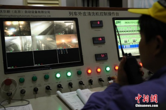 1月8日晚,一列和谐号高铁列车缓慢驶入上海虹桥动车运用所,车头部分沾满了厚厚的“雾霾妆”,在列车入库前除了对外皮自动清洗外,车头部分还需人工特别精洗“卸妆”,一趟400米的长编列车清洗完毕大约需要45分钟,每组工人一晚要清洗20多个“雾霾车头”,直到清晨。图为工作人员监测列车驶过自动清洗机。中新社记者 张亨伟 摄