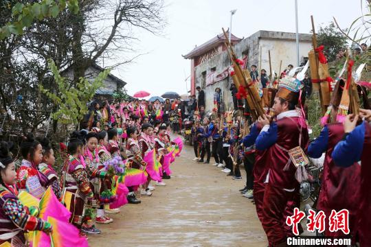 原标题:广西融水村寨“打同年” 演绎少数民族联谊会