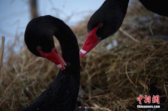 随着新疆和静县北山森林公园生态环境的逐步改善,生活在以“天鹅故乡”著称的和静巴音布鲁克的部分天鹅,开始选择在北山蝴蝶泉过冬、繁衍,由引吸引了很多民众到此观赏。图为黑天鹅爸爸守护着孵化小天鹅的天鹅妈妈。刘学强 摄