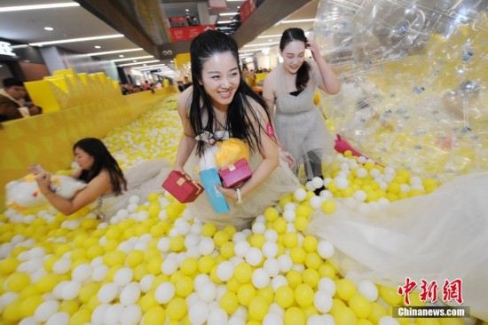 女士们身披婚纱在气球馆里寻找礼物。 韦亮 摄