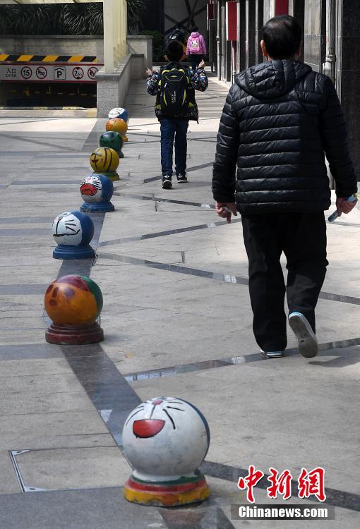 2月15日,在福州市区一小区,原本用来隔离小区机动车和人行道的一排石墩,如今已经被绘上了各种可爱的动漫人物,让单调的石墩成为小区的一道景观。张斌 摄