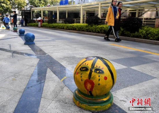 2月15日,在福州市区一小区,原本用来隔离小区机动车和人行道的一排石墩,如今已经被绘上了各种可爱的动漫人物,让单调的石墩成为小区的一道景观。张斌 摄