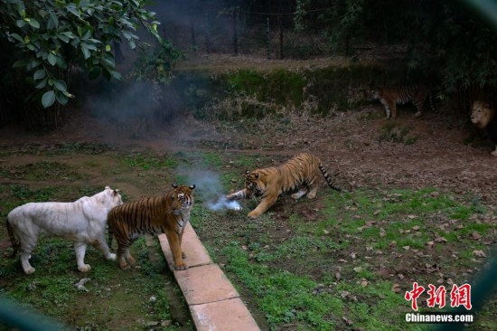 另一群老虎围着电池打量,其中一只突然上前咬上一口,电池瞬间爆燃冒烟。王成杰 摄