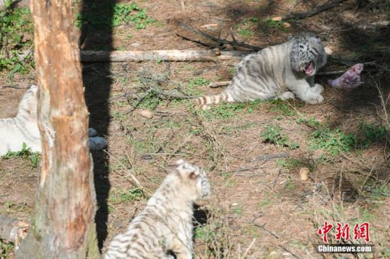1月17日,小白虎在户外抢食。当日,位于昆明的云南野生动物园内的6胞胎小白虎踏出居住了近5个月的笼舍,与虎妈妈一起在户外玩耍与游客见面。据饲养员介绍,这6只小白虎是虎妈妈一手带大,身体比较健康,而且从未与人类接触,野性十足。中新社记者 任东 摄