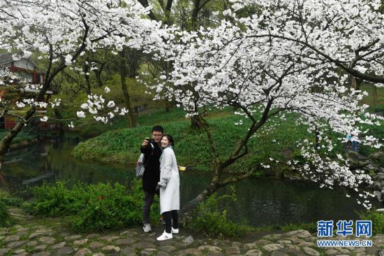 3月19日,两名年轻人在太子湾公园的樱花树下留影。 新华社记者 黄宗治 摄