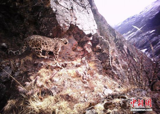 4月10日,记者从西藏昌都丁青县获悉,在丁青县当堆乡怒江河谷区域,牧民监测员在三个月的时间内共捕捉到了56次雪豹活动影像,表明该区域是藏东范围内雪豹重要的栖息地之一。中新社发 山水自然保护中心供图