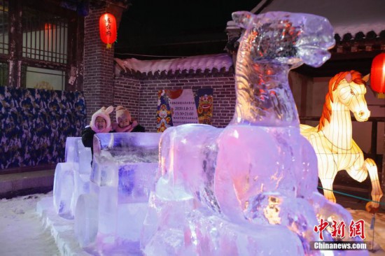 1月9日晚,首届哈尔滨道台府冰雪灯会吸引大批游客前来观赏。灯会以道台府特有的百年风貌和历史故事为内涵,将年节文化中最具代表性的非遗彩灯与哈尔滨的冰雕雪塑艺术无界融合,经典再现了哈尔滨百年前的繁荣场景,为中外游客奉上了一场极致体验的视觉盛宴和新春文化大餐。图为小朋友在“冰马车”上玩耍。 中新社记者 吕品 摄